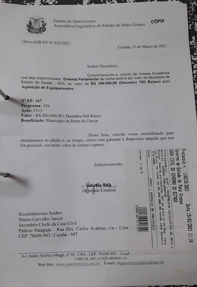 Para obter o recurso, o vereador Zé Gota fez tratativas com a deputada Janaína Riva, a quem agradeceu o apoio e a contribuição com a saúde pública de Barra do Garças. “A Janaína Riva é uma deputada que tem feito um ótimo trabalho, especialmente no envio de emendas parlamentares para ajudar no custeio da saúde de várias cidades e graças ao nosso empenho e do Prefeito Dr. Adilson Macedo, conseguimos que ela nos enviasse esse importante recurso, que muito vai contribuir para a nossa saúde pública, além da amizade tenho uma grande parceria junto a deputada Janaína Riva, e ela sempre vem ajudando o nosso município”. destaca o vereador.